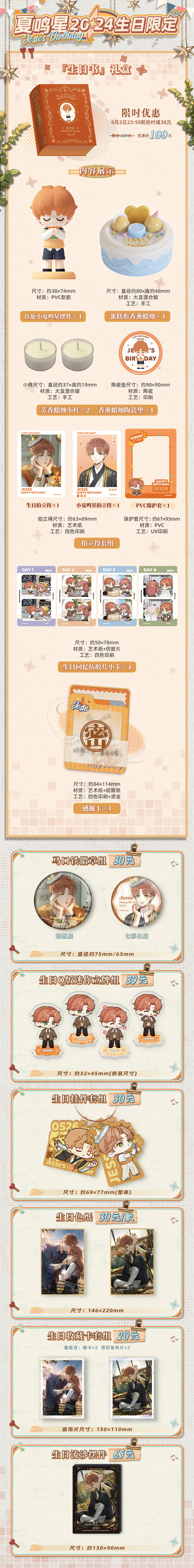 ◆ 夏鸣星生日Q版迷你立牌组、生日Q版挂件套组、生日流沙摆件、生日徽章组、生日色纸、生日收藏卡组六款新品限时预售上线,夏鸣星2024生日周边新品限时预售时间:5月26日中午12:00-6月10日 23:59
