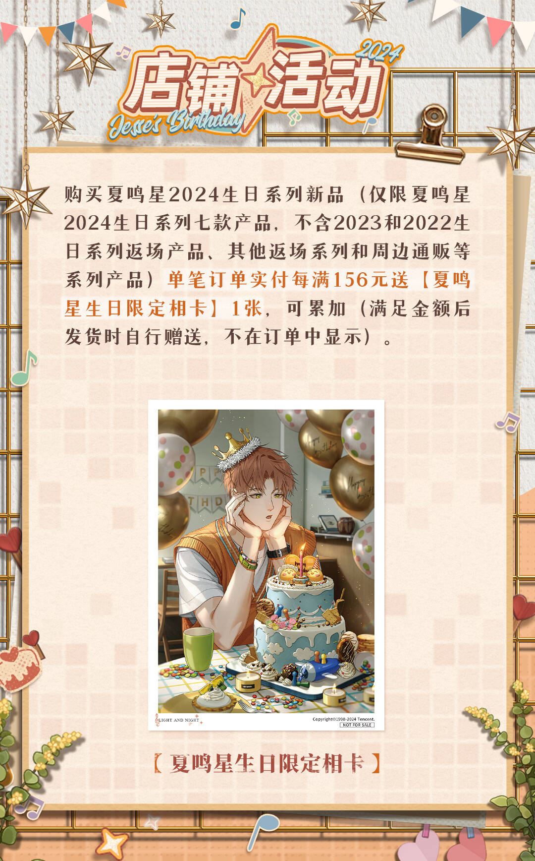 ◆ 购买夏鸣星2024生日系列新品(仅限夏鸣星2024生日系列七款产品,不含2023和2022生日系列返场产品、其他现货返场系列和周边通贩等系列产品)单笔订单实付每满156元送【夏鸣星生日限定相卡】1张,可累加(满足金额后发货时自行赠送,不在订单中显示)。