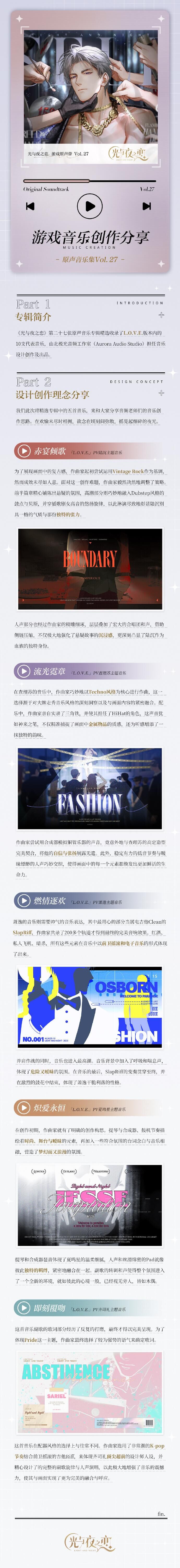 《光与夜之恋》第二十七张原声音乐专辑正式上线,专辑内精选收录L.O.V.E.版本内的10支代表音乐。低语碰动心弦,一切沉溺的、渴求的,都坠入了温热的梦乡。