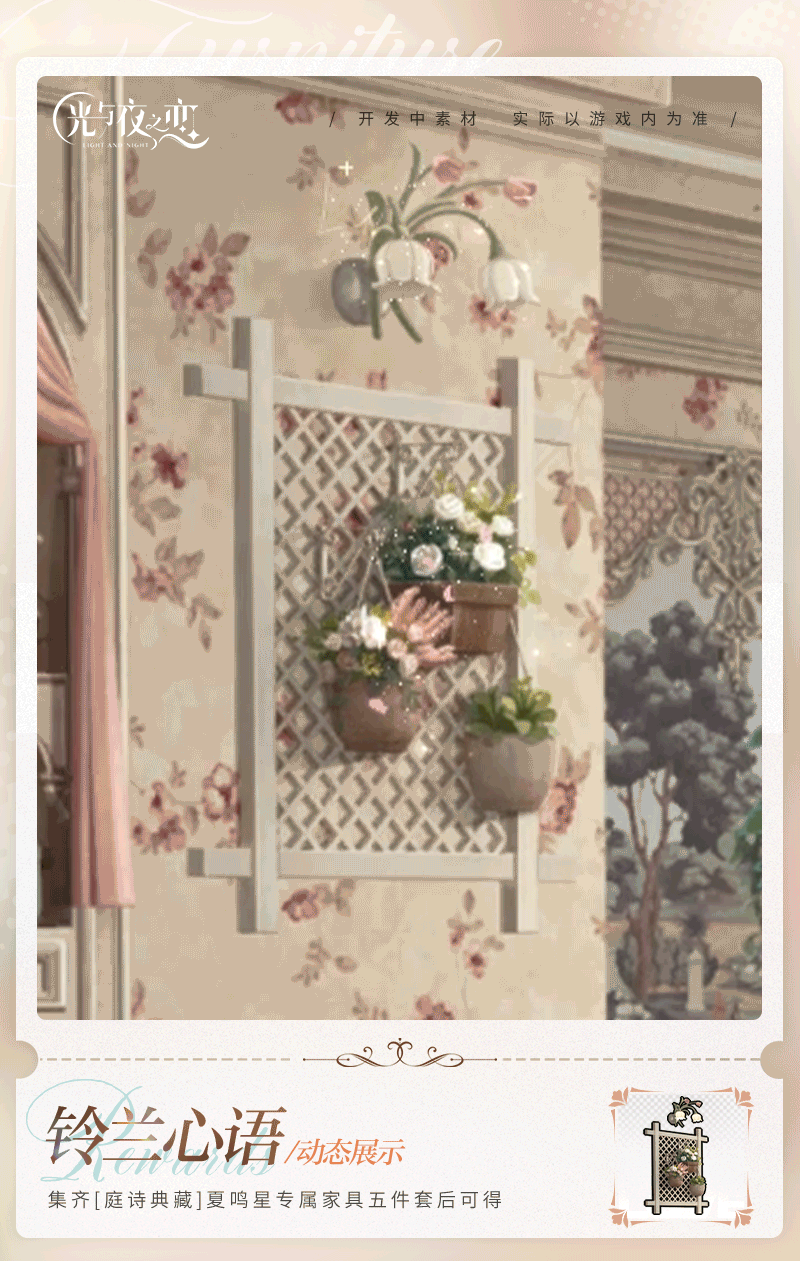 制作集齐[庭诗典藏]系列夏鸣星专属家具五件套后,可在长期计划处领取纪念动态家具图纸。