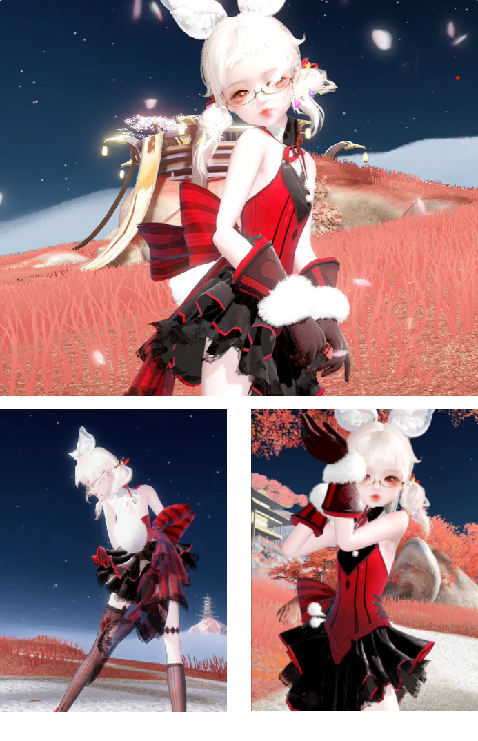 抖动的狐狸耳朵下缀上饱满的黄色蝴蝶结,颈间红色丝带与身后长长拖尾随活泼动作一同轻盈跃起……是谁家秋波盈盈的灵俏小狐狸?