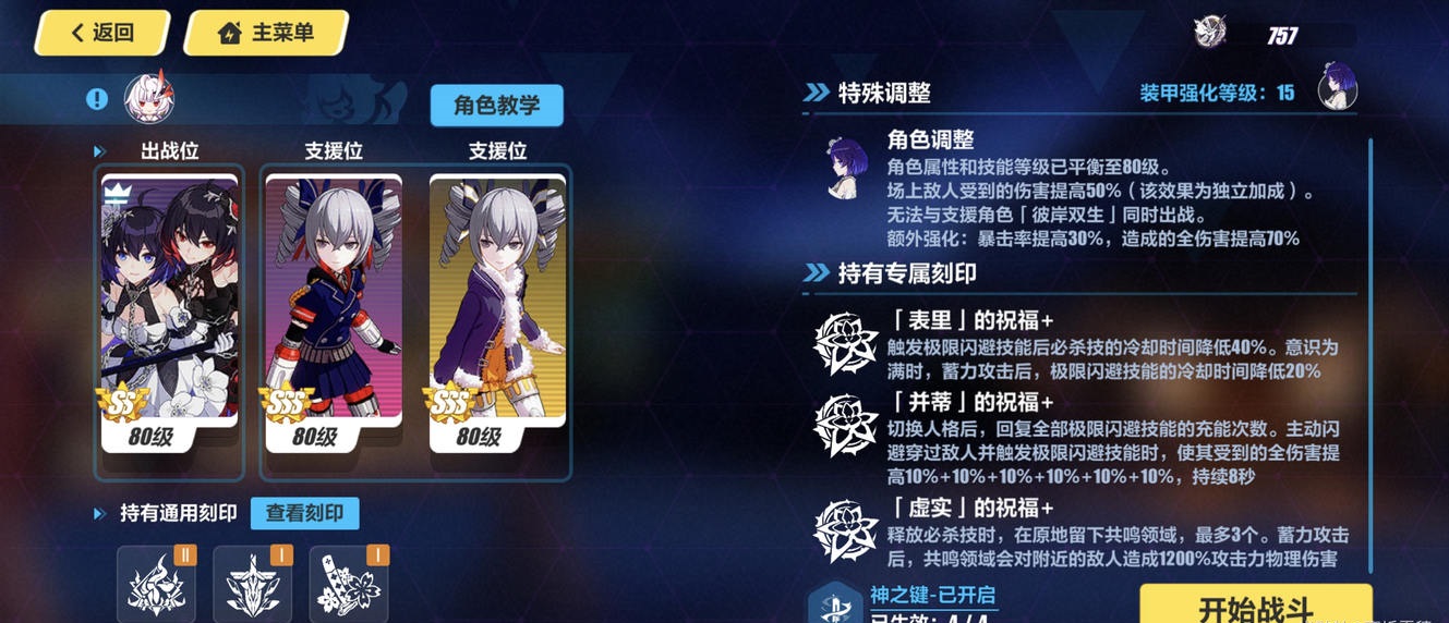 推荐带故事书减负开局轻松很多,专属首选虚实,1200%的倍率补强正是老角色乐土最缺少的属性,然后双倍层用故事书获取并蒂和表里,打法就是开大→蓄力→对敌人方向闪避穿过敌人触发回满动能→再蓄力→再闪避→蓄力有大开大然后循环闪避蓄力操作