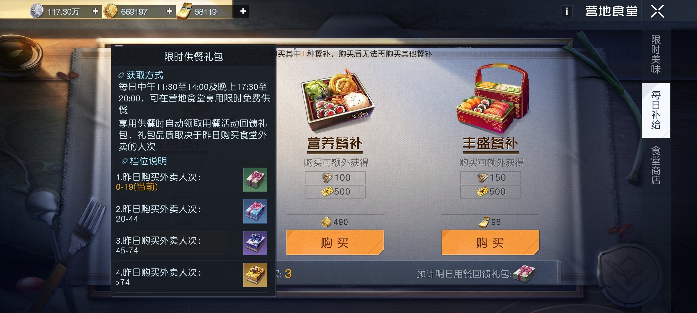 个人建议最好在开服当天14点前加入一个比较好的初始营地。因为营地活动【限时美味】午间的供餐时间在11:30-14:00。