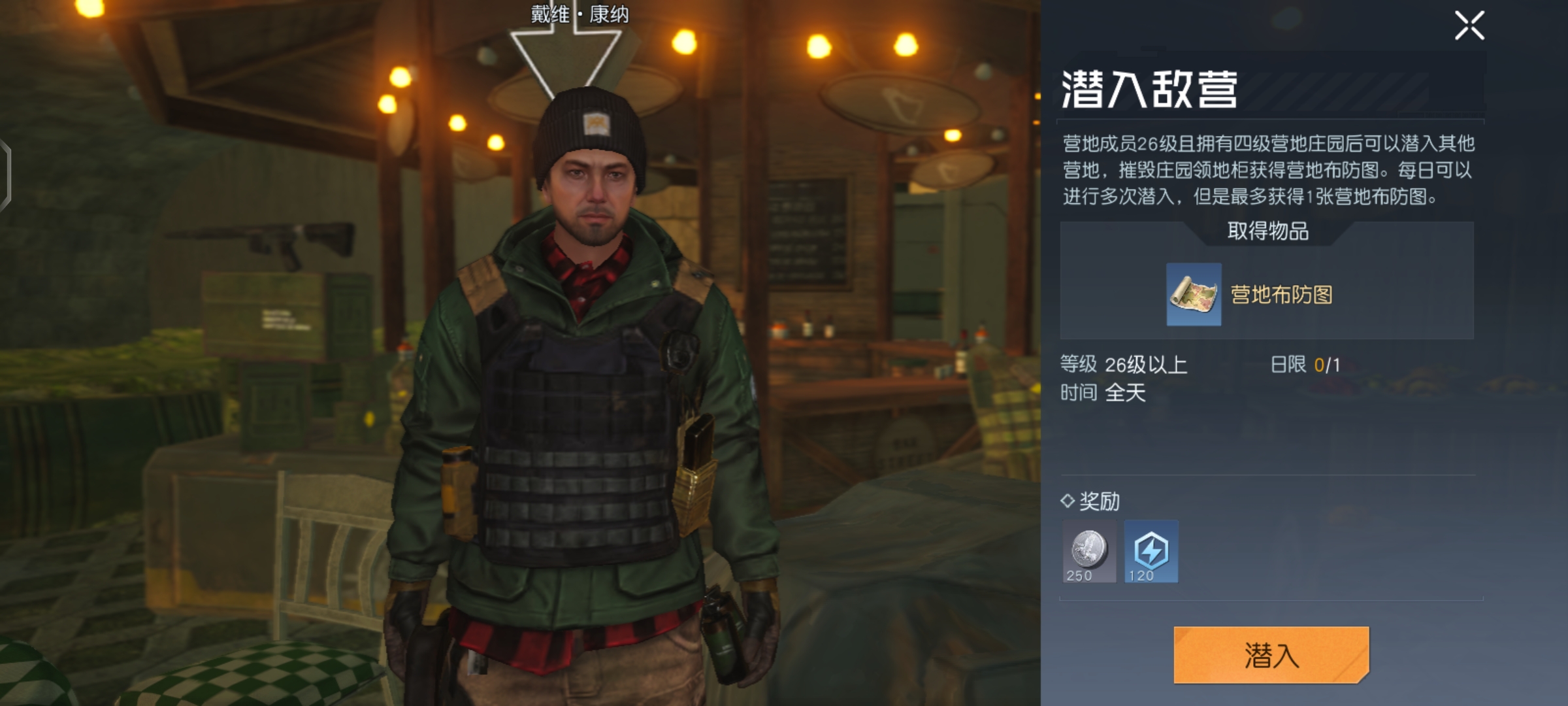 当幸存者等级达到26级且拥有四级营地庄园后便可参与一个特殊的营地活动【潜入敌营】。但【破解卡】无法对4级以下的营地庄园的庄园大门使用。