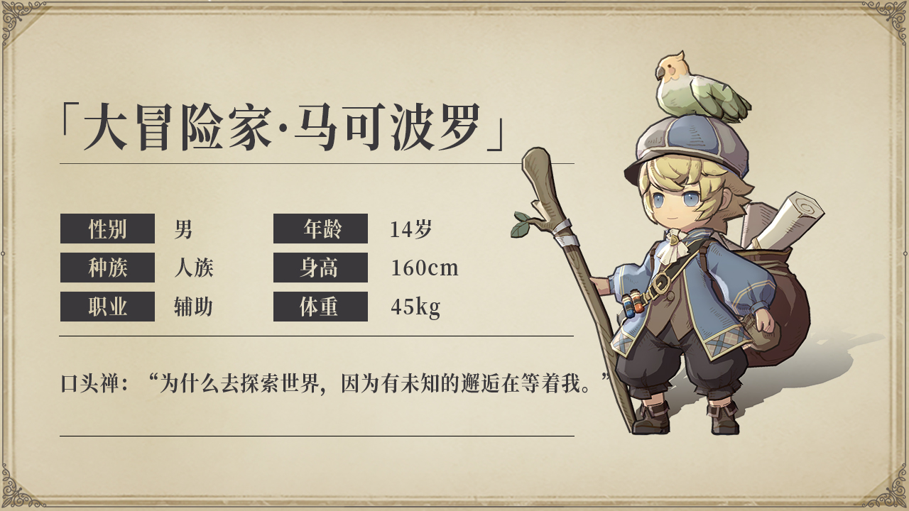 「大冒险家·马可波罗」是一名热爱冒险的旅行商人。他常常手执木杖,还有一只鹦鹉陪伴在身边。他喜欢旅行、做生意、收集稀奇古怪的东西,讨厌欺诈行为和不诚信的行为。他是个乐天派的旅行商人,每天都活力满满。