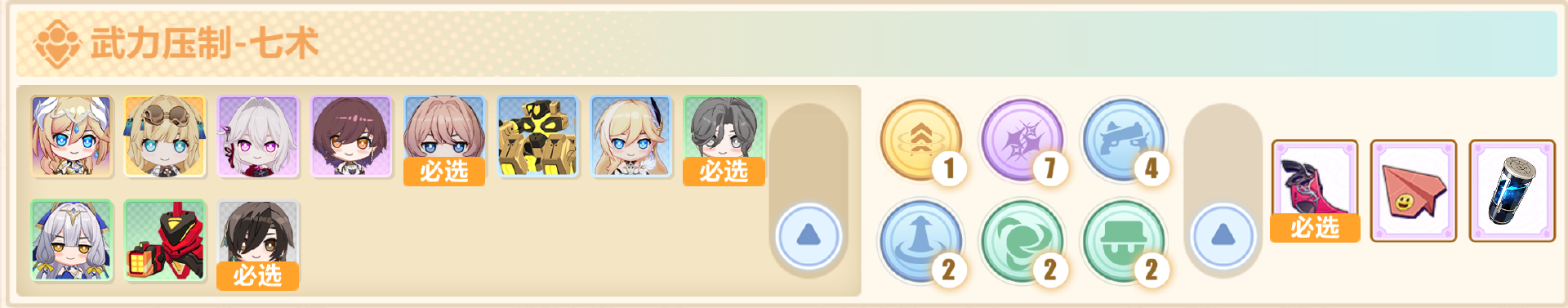 ✦ 使用游戏内推荐的「武力压制-七术」阵容,按照上文提到的该阵容的运营思路游玩即可。