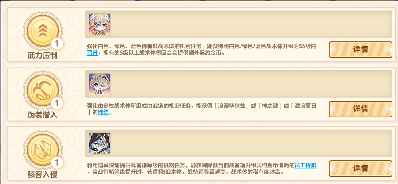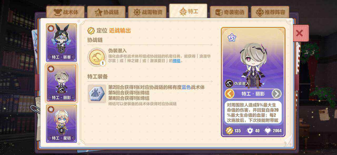 ✦ 本期活动新增的「特工机制」是这次的核心机制,在游戏的第二回合可以从三位特工中选择一位协助作战,三位特工的技能分别代表着三种运营流派,会影响整局游戏后续的运营思路和策略。下文中会对三位特工的技能和流派做详细的解释和介绍。