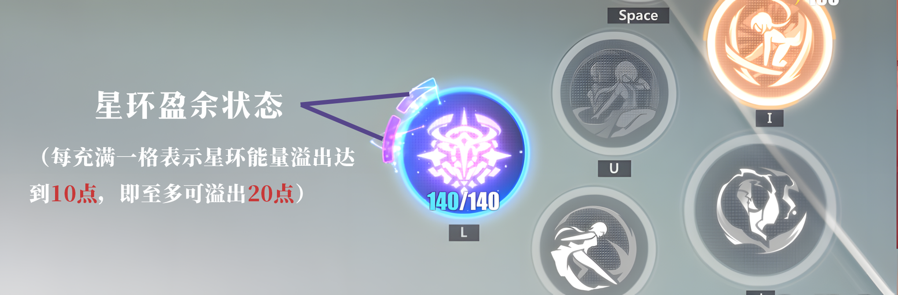 丽塔位于影队时,在星环蓄能状态下,当星环能量达到上限时将进入星环盈余状态,该状态下可溢出至多20点星环能量,开启星环爆发时退出该状态。