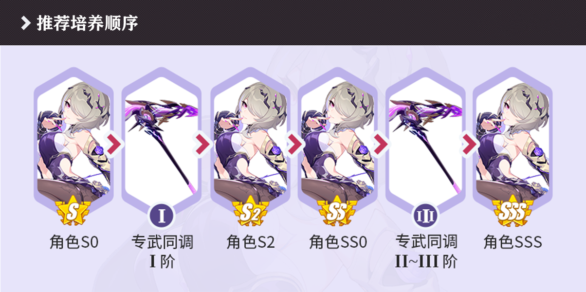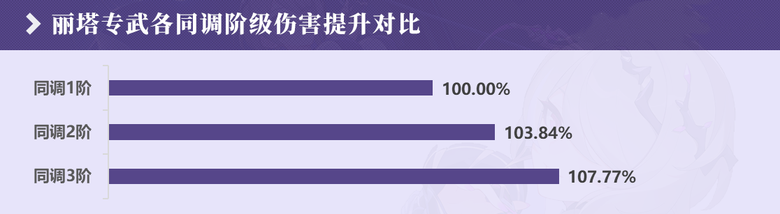 (2)同调推荐:提升同调阶级的效果为【提高场上角色的独立全易伤与自身的独立雷易伤】,由于丽塔作为辅助时,专武同调对自己的提升程度有限,因此推荐获取一把(同调Ⅰ阶)即可。