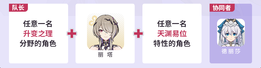 ✦ 队伍搭配方面,主要以【丽塔+元素贯穿辅助+增伤辅助】的模式为主,元素贯穿辅助位主要以希娜、薇塔为主。增伤辅助位可根据应对环境或自身的养成情况进行选择,例如在应对虚数天的虚数属性敌人时,携带小呆鹅可进一步提高队伍的虚数穿透能力。