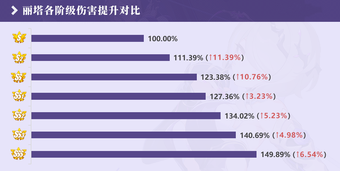 ②由于在S2、SS0阶级提高了丽塔对虚数敌人的伤害传递,因此在应对虚数敌人时,S2、SS0会比以上展示的提升幅度更高
