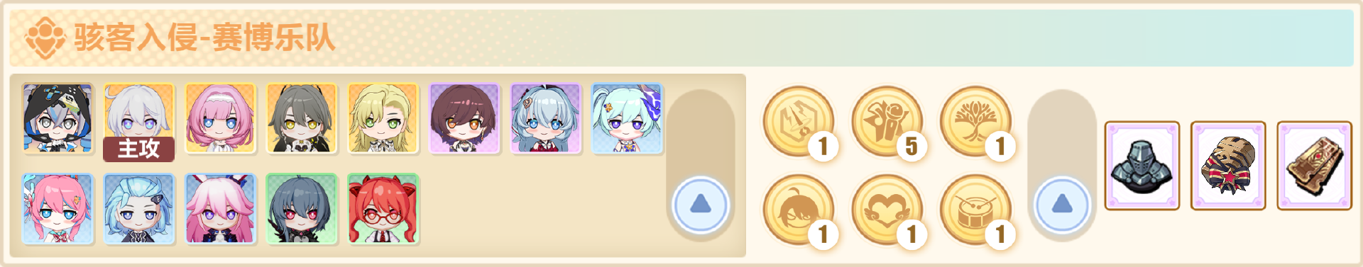 ● 在升级到6级商店后(通常是第8回合),这个时候的主要目标是凑齐5「人气偶像」羁绊。全力找「琪亚娜·吉星」、「时雨绮罗」,以凑齐5「人气偶像」羁绊。其他「赛博乐队」阵容中的卡牌,看到了也可以购买,但不要升星。