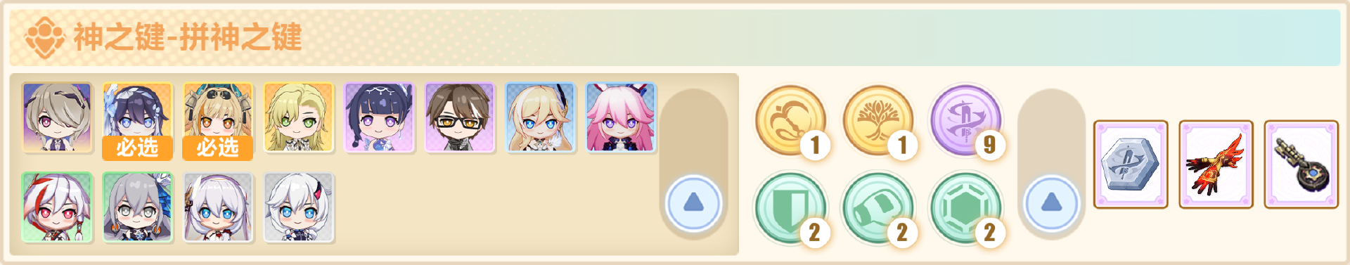 ● 在凑齐上述卡牌后,运营基本就结束了,「神之键」阵容的提升基本到此为止。剩下的时间就尽可能的把这11张棋子升到A级即可。