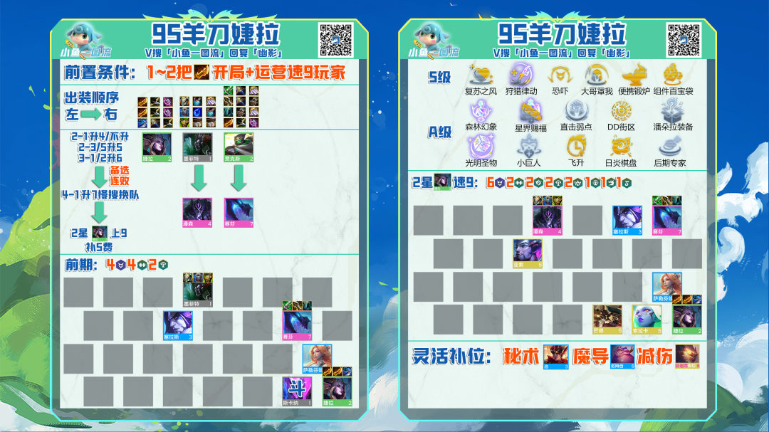 前置条件:1~2把羊刀开局,且此阵容仅适宜擅长运营速9的玩家