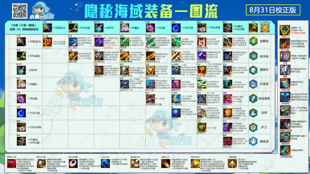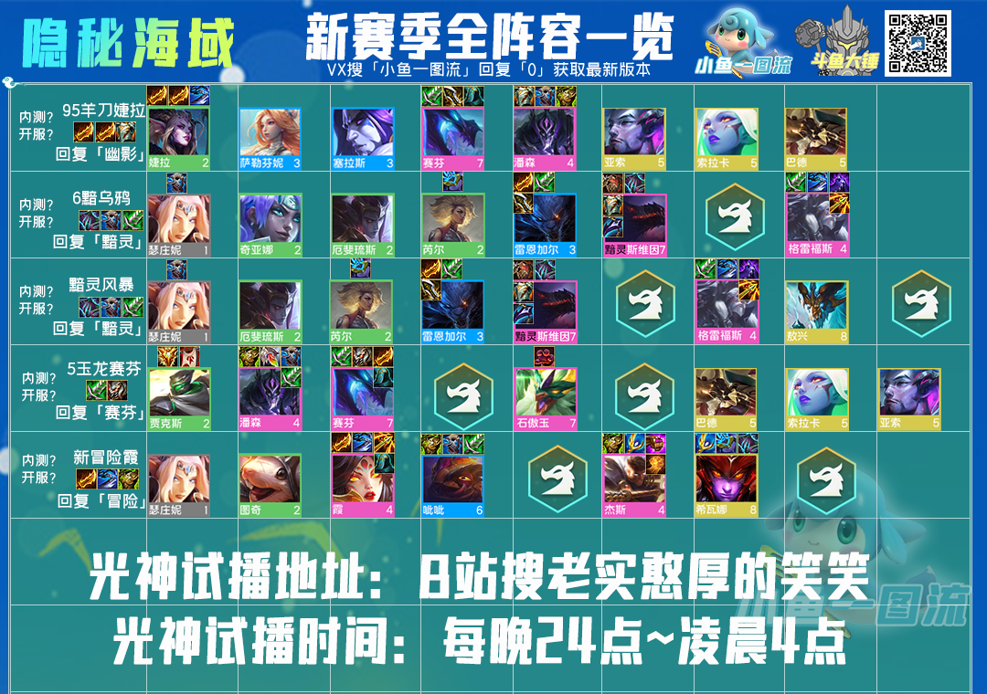PBE改动:最近一次幽影改动是幽影羁绊1/3/6改为1/3/7,所以6幽影目前反而是加强的,潘森大砍过攻击力,芬妮也有大砍,强的是婕拉配羊刀高频减双抗,强度直逼2星上9,这张一图流如果有理解上的大突破,会翻新一篇文章,最新版一图流以公众号「小鱼一图流」后台回复「幽影」为准!