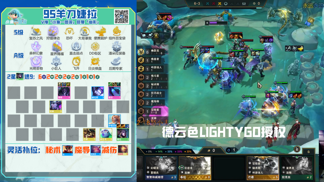 中后期节奏:4-1升7,靠幽影和羊刀婕拉的强度划水上9,实在上不去就8级开搜,除了6幽影+萨勒芬妮以外,其他位置都是灵活位,有这样几种方案,A秘术(巴德>洛都有控制)B控制(亚索还是2狂战)C索拉卡(抬血)D魔导(蛙妃需要魔导蛙,但2人口换高魔导收益需斟酌,队伍需要的是整体韧性)E土龙(给潘森赛芬减伤)