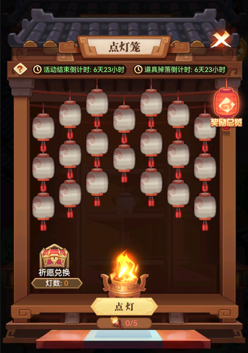 活动期间,消耗指定数量的“灯火”,即可在「活动-点灯笼」中随机点亮1-3盏灯笼,主公将有机会获得一定数量的青玉、蓝玉、橙色宝物箱等稀有养成道具。累计点亮的灯笼数量可在祈愿兑换中兑换蓝玉、柏梁请柬、黄月英邀请函、华佗邀请函等珍贵物品,助力主公征战天下。