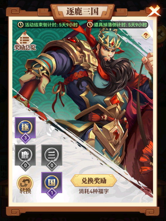 活动期间,开启活跃度宝箱可随机获得“逐”、“鹿”、“三”、“国”中的一种福字,集齐4种福字后,可在「活动-逐鹿三国」中兑换一次奖励,主公将有机会获得元宝、请柬、文会请柬、橙色求贤令等多种稀有道具,同时收集对应数量的福币更可兑换柏梁请柬、橙色武将等珍稀养成道具哦!
