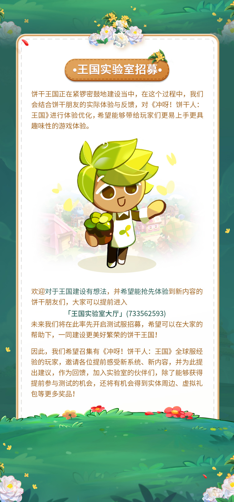 除了进展同步外,为了收集更多饼干朋友的想法,我们将开启「王国共创邀请」「王国实验室」两条通道,邀请饼干朋友对国服全新内容进行共创与调优。今后,请与我们一同打造繁荣的饼干王国吧!