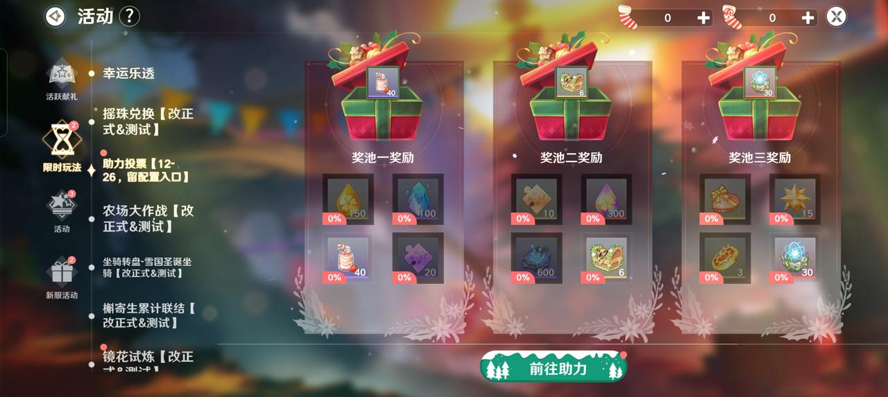 新增圣诞活跃玩法,活动分为普通助力和神佑助力,奖励包含了各类游戏道具,投票结果不一样,奖励不一样