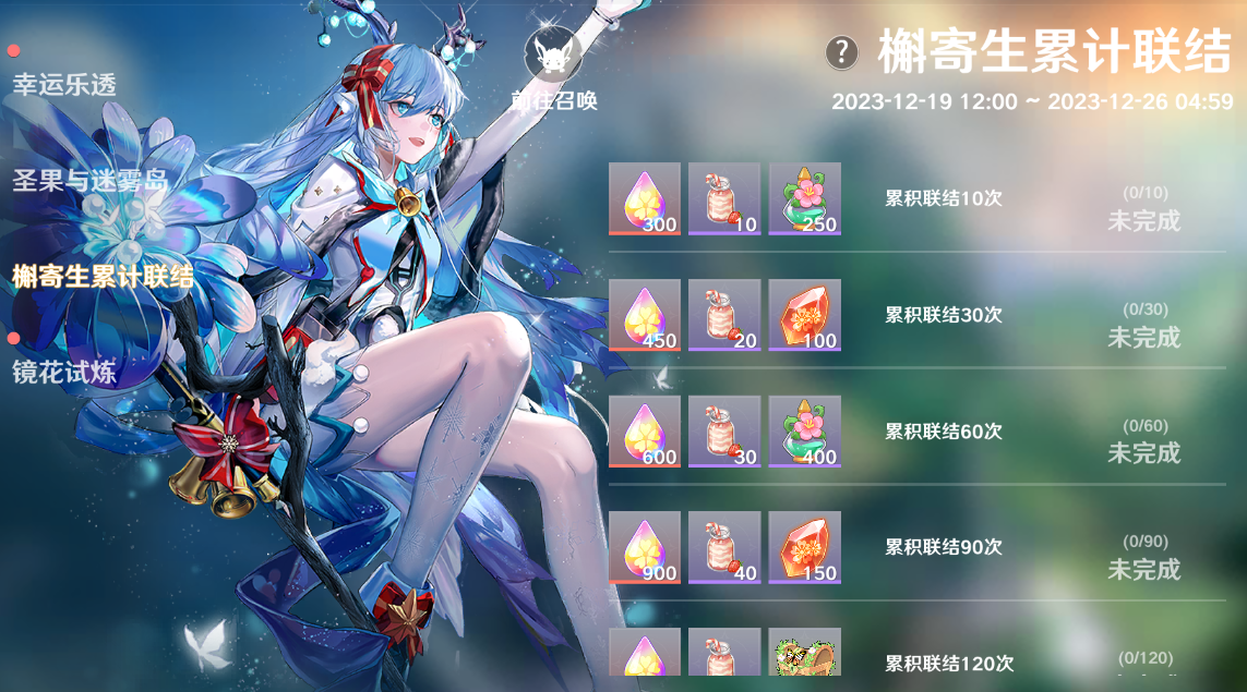 ‣同时还有槲寄生累计联结,在槲寄生的联结中达到指定次数可以领取游戏奖励(元素召唤种子、 草莓牛奶、蜕变之药、蕴灵宝石、槲寄生碎片、自然馈赠宝箱)
