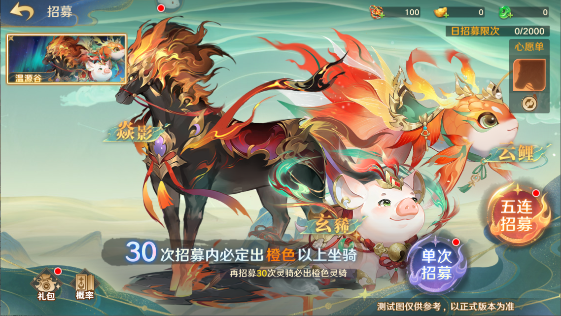 3.在心愿单中,玩家可以加入自己心仪的橙品灵骑。橙色品质灵骑本身的招募概率不变,但是招募出橙色灵骑时,随机到心愿神将的概率会上升。
