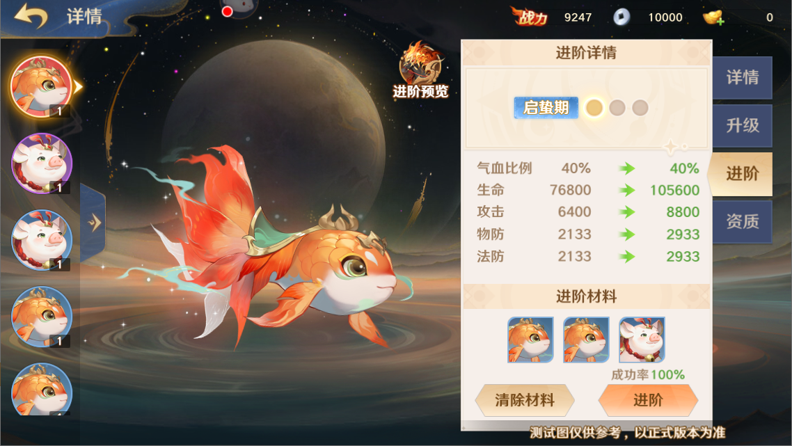 进阶灵骑,将可以提升其天赋技能、资质和属性,进阶需要以其他未上阵灵骑作为材料,选择材后可提升进阶成功率,成功率可通过选择多只灵骑累加,使用与进阶目标同类型的灵骑,成功率可提升1.5倍。