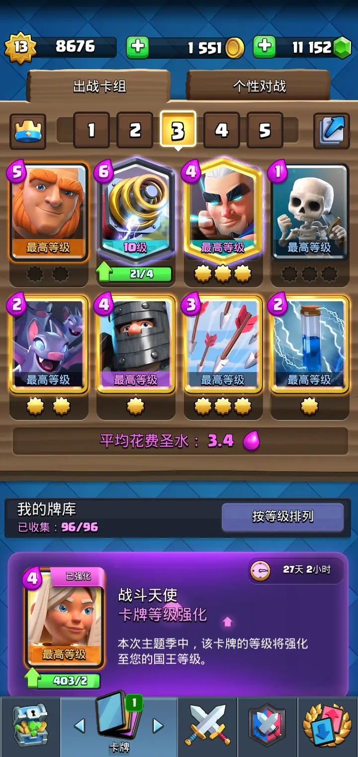 单卡来说,蓝胖具有变态的地面防守能力,在这个地面快速打击为主的环境中可以非常有效的防守精锐,女巫,女武神这类卡牌。所以在这个分段的蓝胖使用思路就是把它当成一个理想的纯防守工具人卡牌,利用防守赚费再配合打塔单位进行蹭血,从而取得游戏的胜利,以这个思路来进行配卡,我推荐了以下这套模板卡组(有效应对环境的卡组,如果不想主动配卡可以直接抄来用,上手难度不大,多打打绝对会有思路)