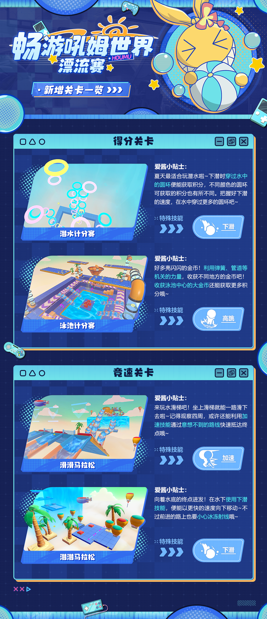 本次「畅游吼姆世界-漂流赛」将新增4张关卡地图,相关情报请舰长查看下方的长图说明~