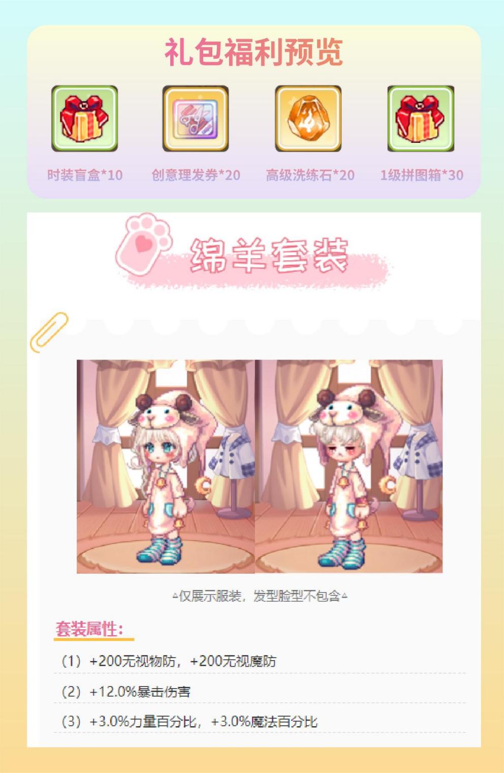 完成七月累计签到,可获取创意理发券、高级洗练石、1级拼图箱、全新主题服饰【绵羊套装】盲盒等丰厚的道具奖励(*^▽^*)