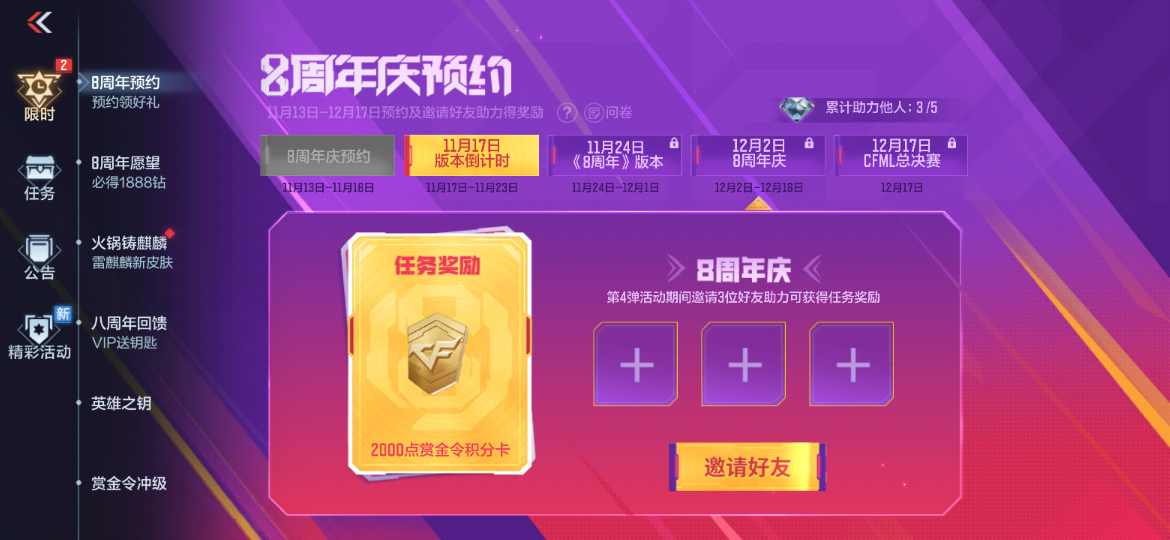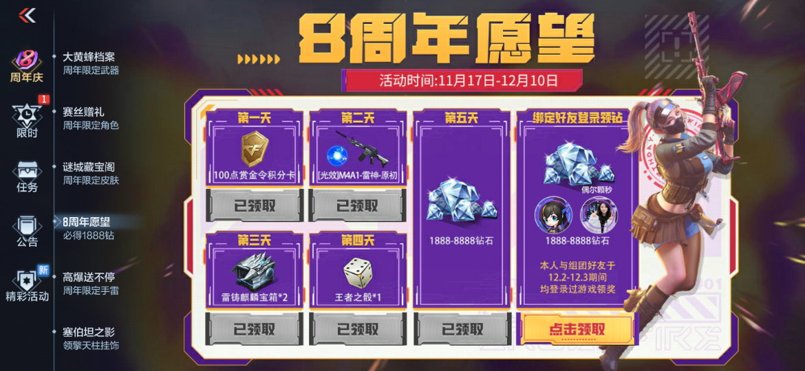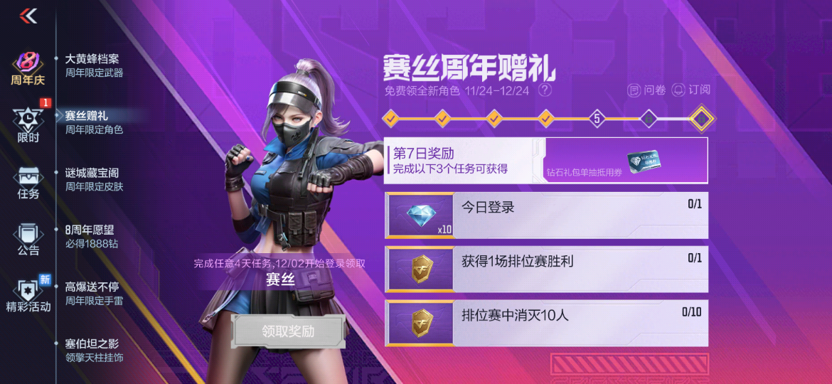 青春无敌美少女赛丝也为你送来了8周年礼物,钻石、赏金令积分、王者之骰等奖励送个不停。更惊喜的是,12月2日起,完成任意4天活动任务的CFer即可直接领取全新角色赛丝!