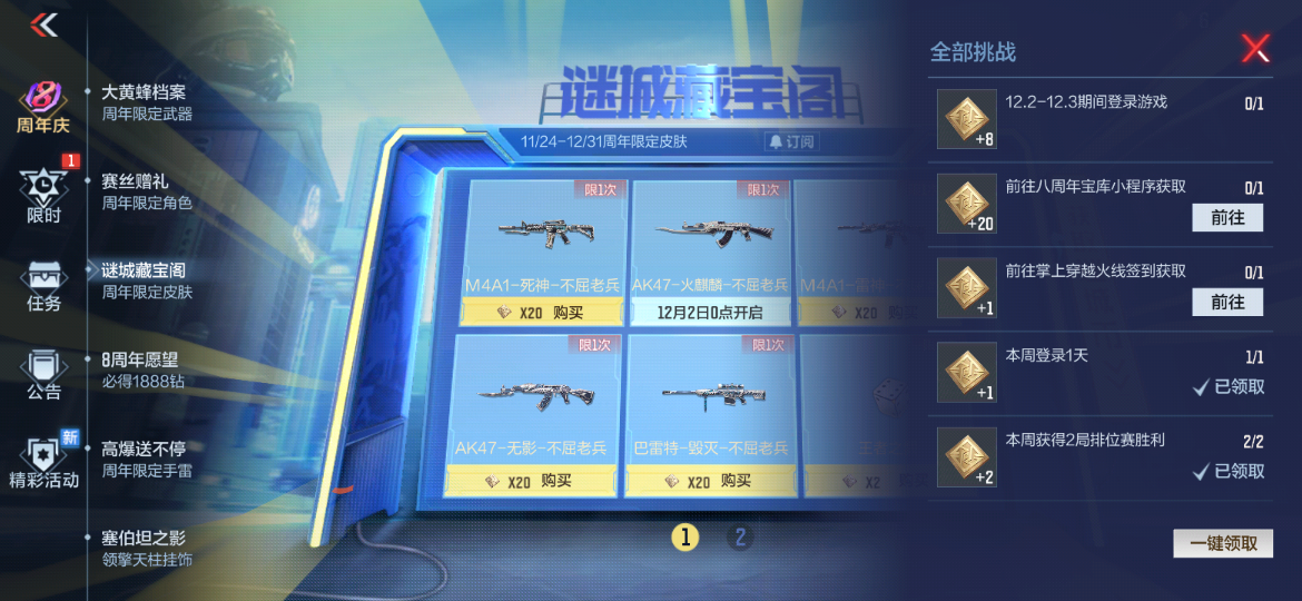 谜城币不够的CFer也别急,大家只需在12月2日-12月3日登录游戏,即可直接领取8个谜城币。而且八周年宝库小程序、掌火签到等渠道也会放送大量谜城币,AK47-火麒麟-不屈老兵、M4A1-雷神-不屈老兵、AK47-无影-不屈老兵、巴雷特-毁灭-不屈老兵等稀有皮肤触手可及!