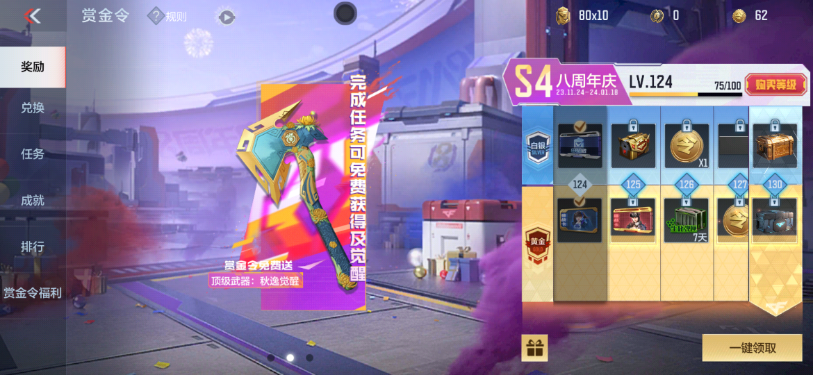 然后是八周年免费赏金令,CFer们可以在活动期间免费激活黄金版S4赏金令,并通过不断提升赏金令等级,获取全新国风四季主题武器秋逸觉醒、经典武器M200-暗金风暴、黄金丛林匕首、黄金左轮等海量福利道具。将S4赏金令等级提升至200级,还可以获得24-S1赏金令激活卡,相当于把CF手游8周年庆福利从今年送到了明年!