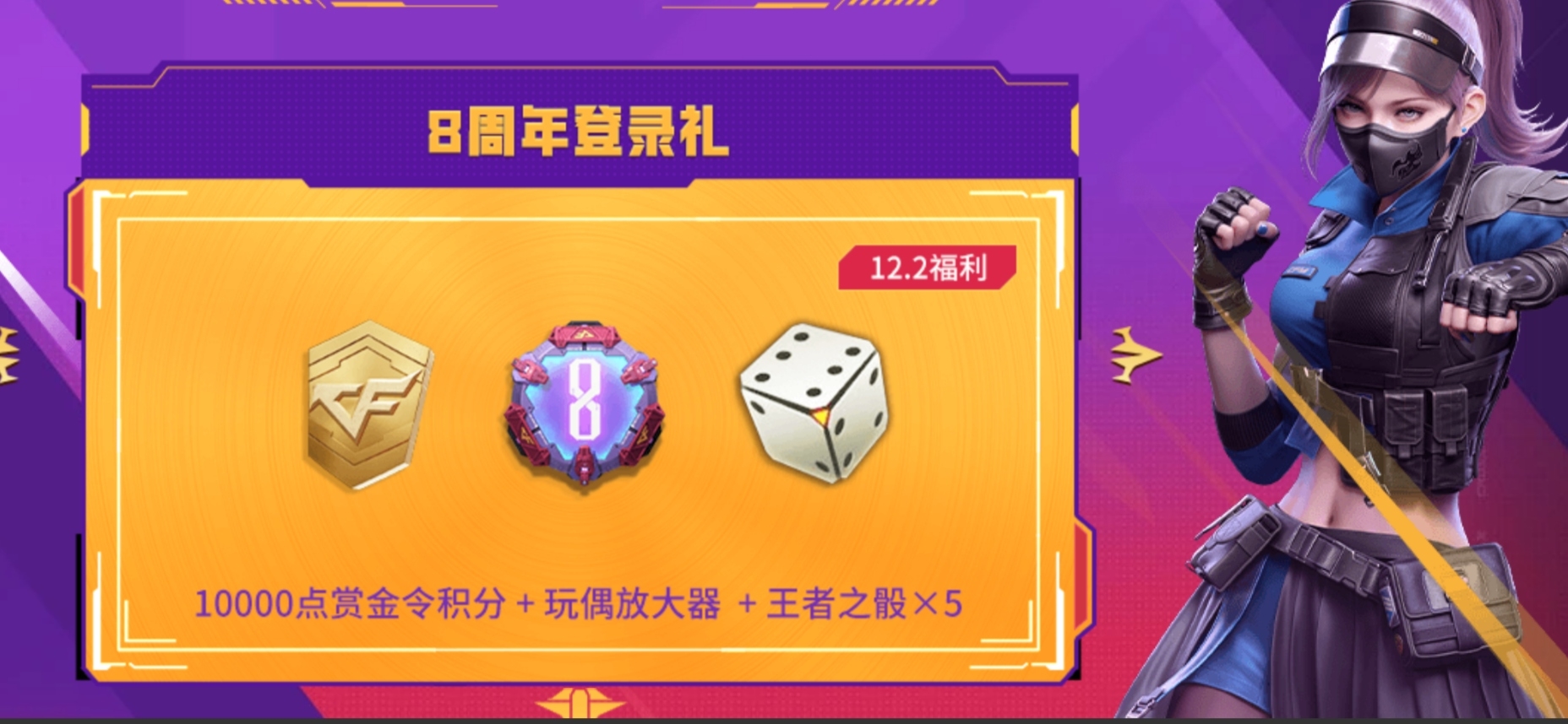 最受懒人玩家欢迎的,是会在CF手游8周年庆当天上线的周年庆登录礼活动。CFer们只需在12月2日-12月17日累计登录游戏,即可领取玩偶放大器+王者之骰*5+ 10000点赏金令积分!