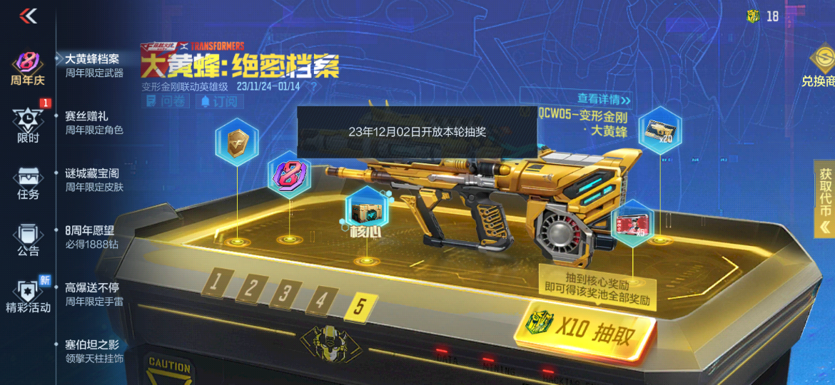 首先是福利满满的大黄蜂:绝密档案活动,12月2日开始,CFer们只需完成游戏登录,即可前往活动页面领取180-300个大黄蜂徽章。与此同时,第5轮奖池也会开放抽取,届时大家可以收集足够的大黄蜂觉醒石,觉醒全新福利英雄级武器QCW05-变形金刚·大黄蜂!