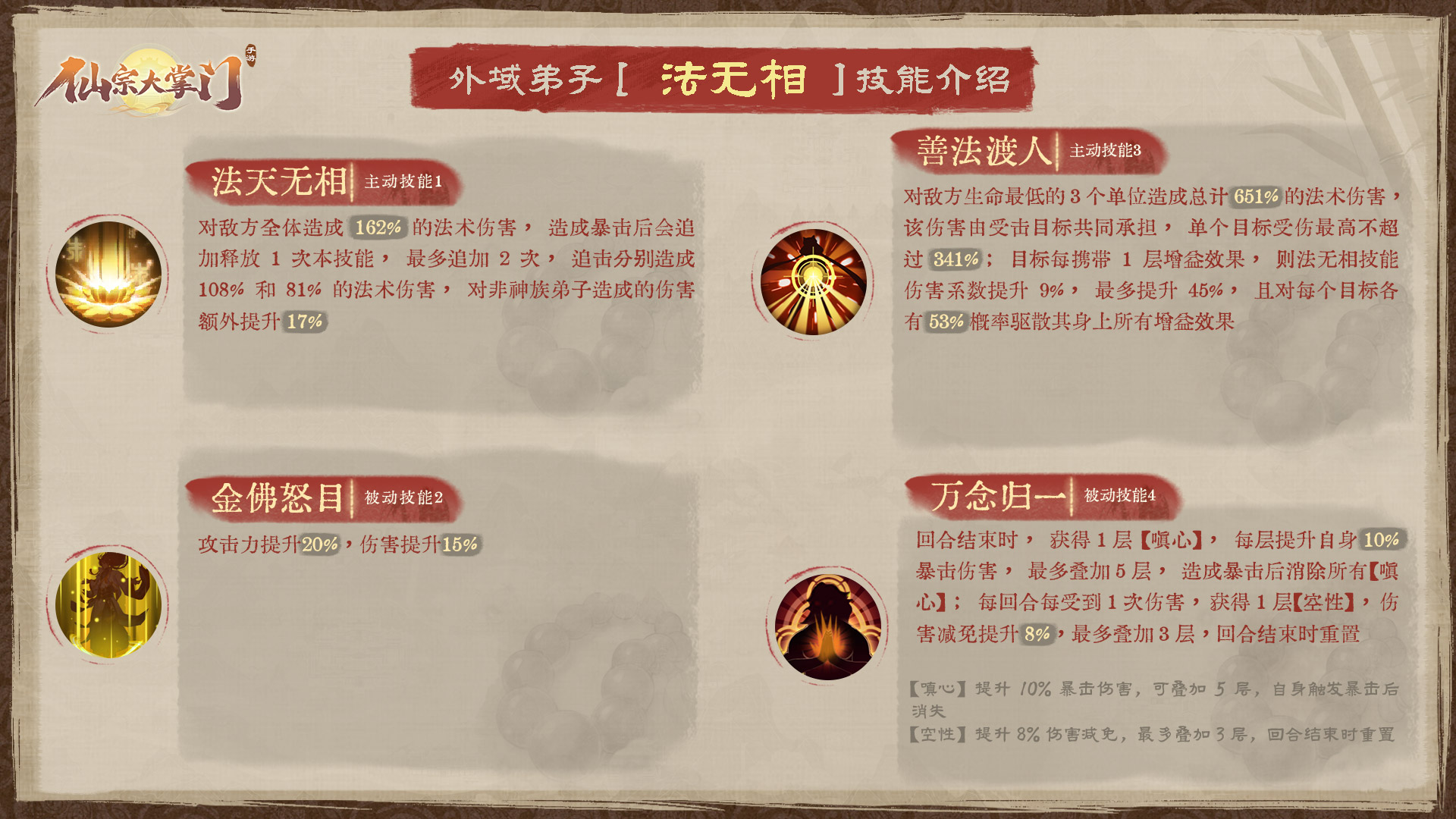 值得一提的是被动技能【万念归一】可为自身叠加【嗔心】和【空性】双重buff,既可以提升暴击伤害,又可以提升伤害减免,搭配主动技能进行输出,不可谓不恐怖。