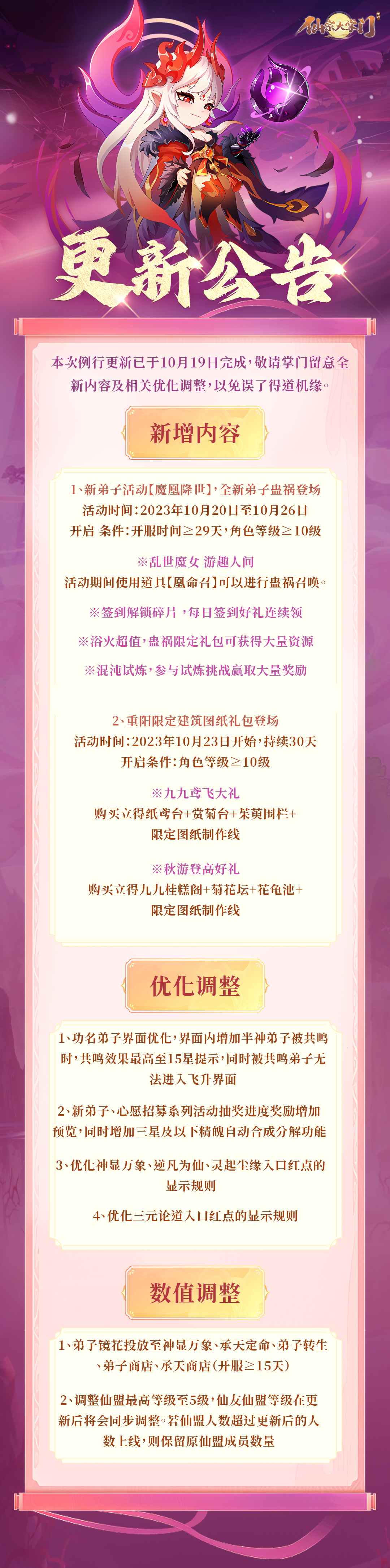 尊敬的各位掌门,《仙宗大掌门》本周更新维护已于10月19日上午完成,全新魔族法师蛊祸即将登场,敬请留意。