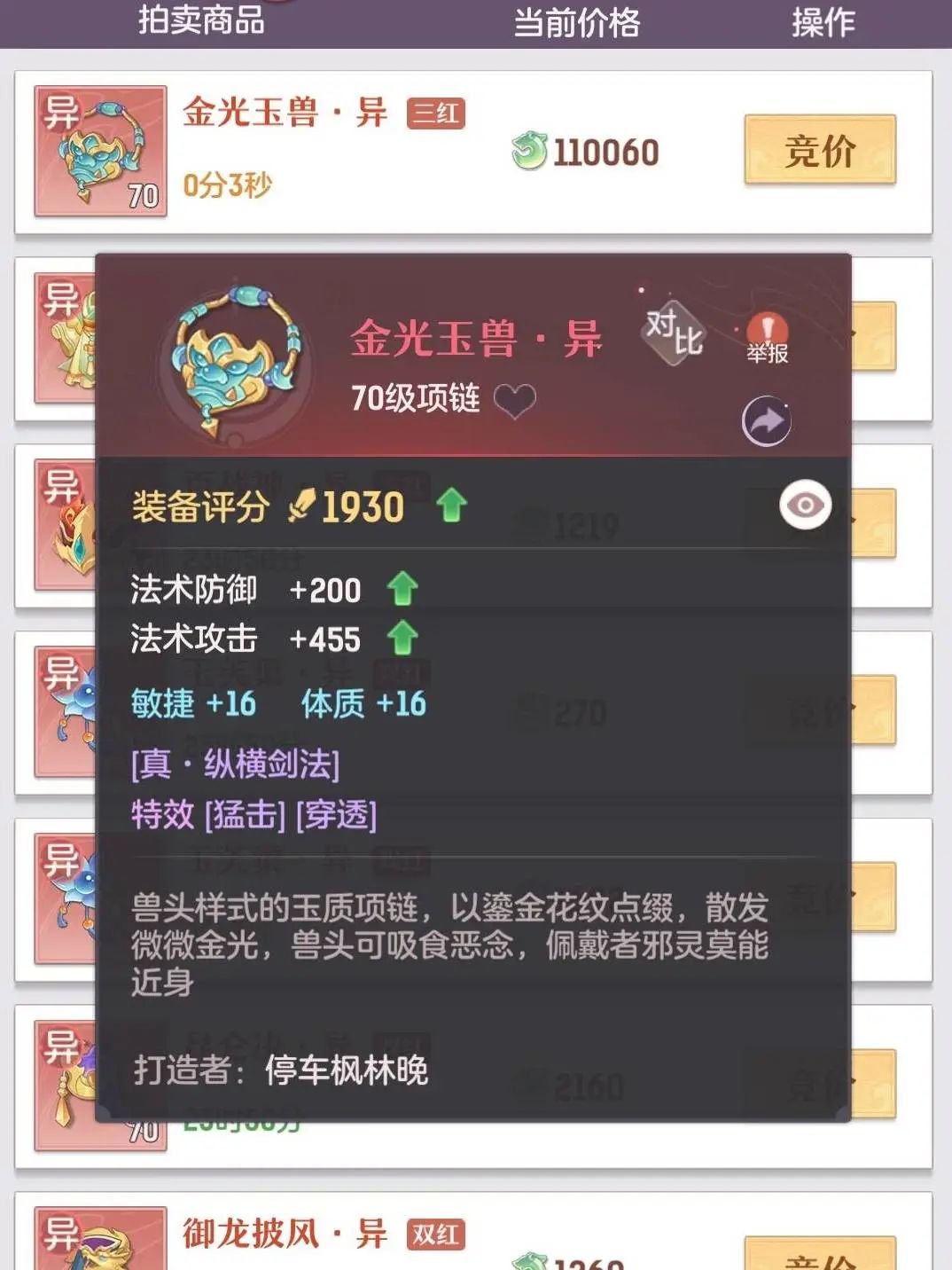 属性不错的三红项链一条,在70等级段能算得上是头部装备的存在,也不枉开出11万的高价~