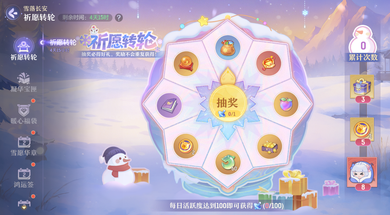活动期间,每天活跃度达到100即可参与转盘抽取好礼,转盘内奖励不会重复获得,参与达到一定次数还可以额外领取节点奖励!