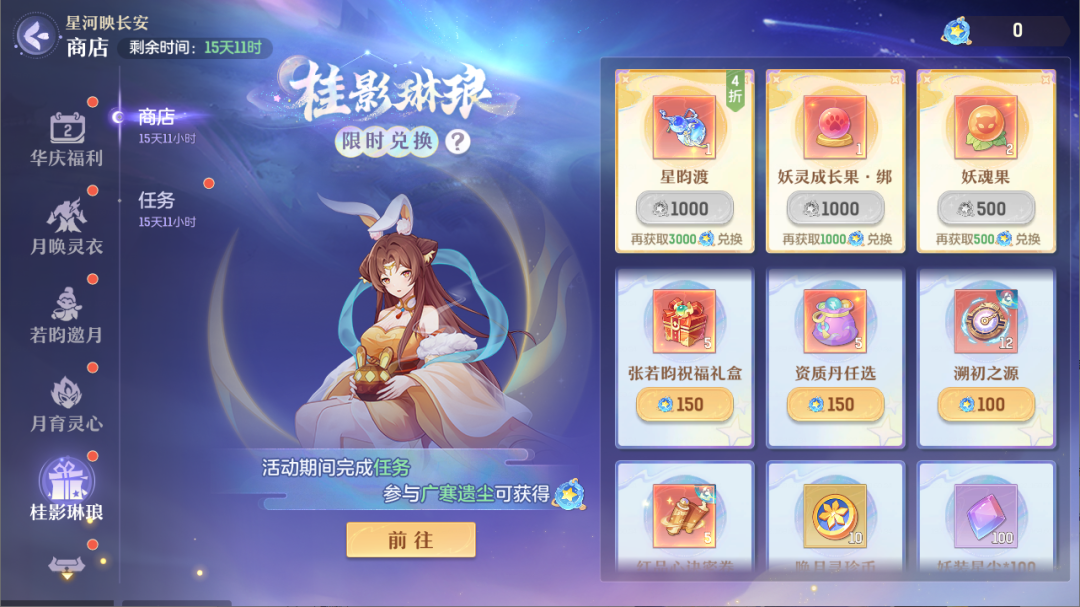 琳琅满目,尽是奇珍。完成活动任务和参与正式阶段玩法获取积分,使用积分换取张若昀联动坐骑<星昀渡>及其他丰厚奖励。
