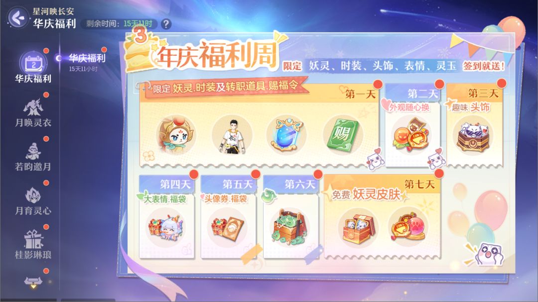 欢庆长安三周年,海量豪礼享不停!年庆福利周活动期间内,登录签到即可领取周年限定妖灵、纪念时装、趣味头饰、全新大表情,以及张若昀祝福礼盒、灵玉、绮罗华章、头像券、转职道具、赐福令、妖灵成长果、妖灵皮肤自选礼盒等惊喜福利!
