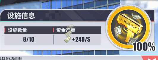2.不同训练设施,每秒会产出不同数量的训练资金,第一种设施的产量是10/s,第二三种设施的产量是20/s,第四五种设施的产量是30/s,第六七种设施的产量是40/s,第八九种设施的产量是50/s,最后一种设施的产量是60/s。