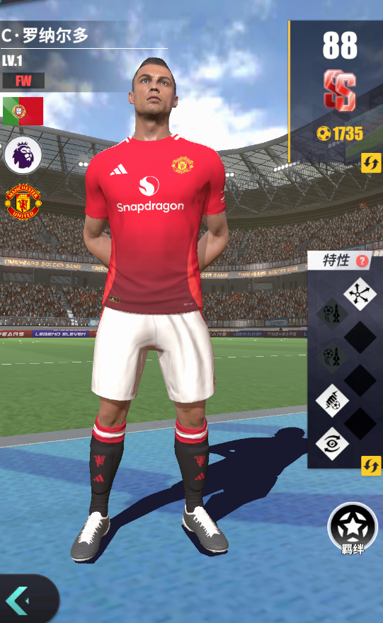 下面给玩家带来几个游戏中曼联球员的球员简单介绍:首先是C罗。在游戏中评分为88分,其球员特性包括:抗压控球,伺机而动,鬼魅切位等特性。抗压控球是指球员降低重心构筑三角护球区,通过身体卡位与初秋频率控制形成绝对保护区,控球成功率提高1.0%。伺机而动是指通过保守传控消耗对手耐心,提升诱敌深入后的反向直塞球质量。比分非领先时,传球与控球属性提高3.0%。