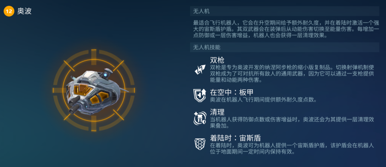 无人机方面, [奥波]作为飞行机甲的最佳搭档,其不仅搭载复刻“武器[纳涅阿]” 双属性伤害的小型双枪,还能在机甲升空时提供额外耐久点数,落地时赋予宙斯盾;更关键的是,当机甲获得防御、伤害增益时,[奥波] 会触发“清理”效果,可移除生锈、致盲、封锁 EMP 等负面状态,同步提升生存能力与容错率,让双子星无惧敌方火力与控制。