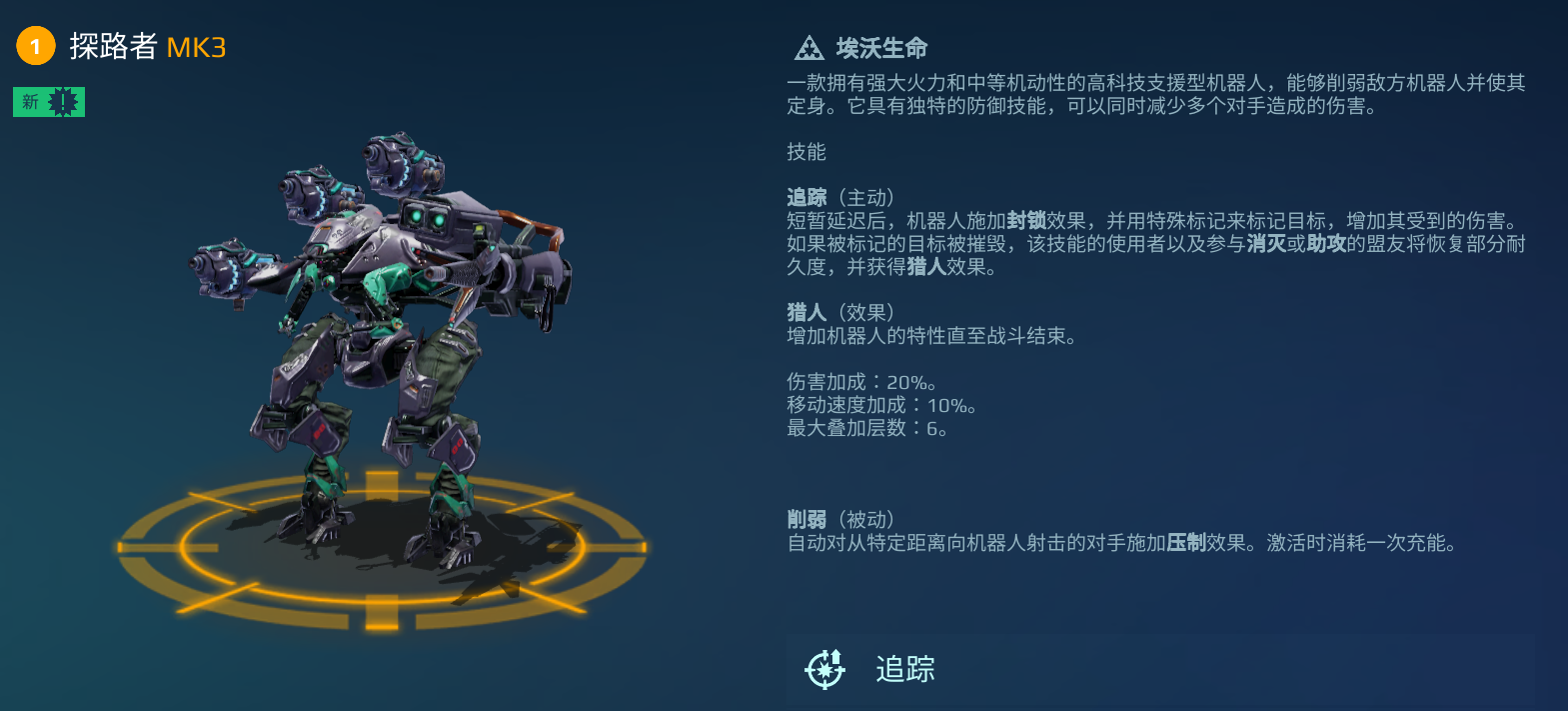 均衡的面板保障了「探路者」的基础作战能力,600m 的技能判定范围,使其无需近身作战,可在中远程战场将辅助能力发挥到极致。主动技能 “追踪” 命中敌人后,会为目标施加封锁与易伤效果,最高可加深 40% 所受伤害,即便面对泰坦级单位,也能打破其短时间内难以摧毁的壁垒,为团队推进、据点对抗扫清障碍。