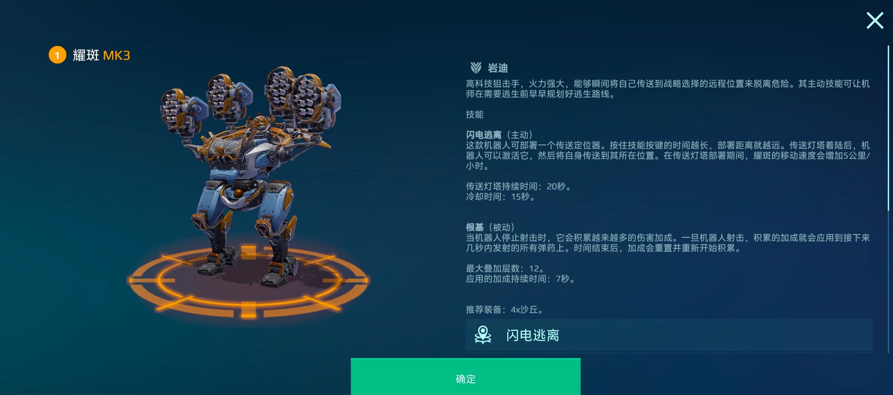 瞬移本是刺客、游走型机甲的专属能力,而[耀斑]的技能「闪电逃离」,能让它完成一轮输出后远程撤离,有效规避敌方针对性袭扰。其传送信标为抛物线投射,可穿透各类高低掩体与障碍物,落地后持续 20 秒,这让[耀斑]不仅能在敌人逼近时被动远遁,还能提前布置信标,与敌人展开两轮火力对垒,待敌方刺客前来袭扰时,实现无前摇脱身。即便面对敌方远程或狙击机甲,对方也会因掩体阻挡对[耀斑]鞭长莫及。而被动技能「根基」,更是[耀斑]制霸战场的核心,停止射击后,下一轮弹药将获得可观伤害增幅,搭配重型武器的高额火力,能实现一轮飞弹直接摧毁目标的恐怖爆发。