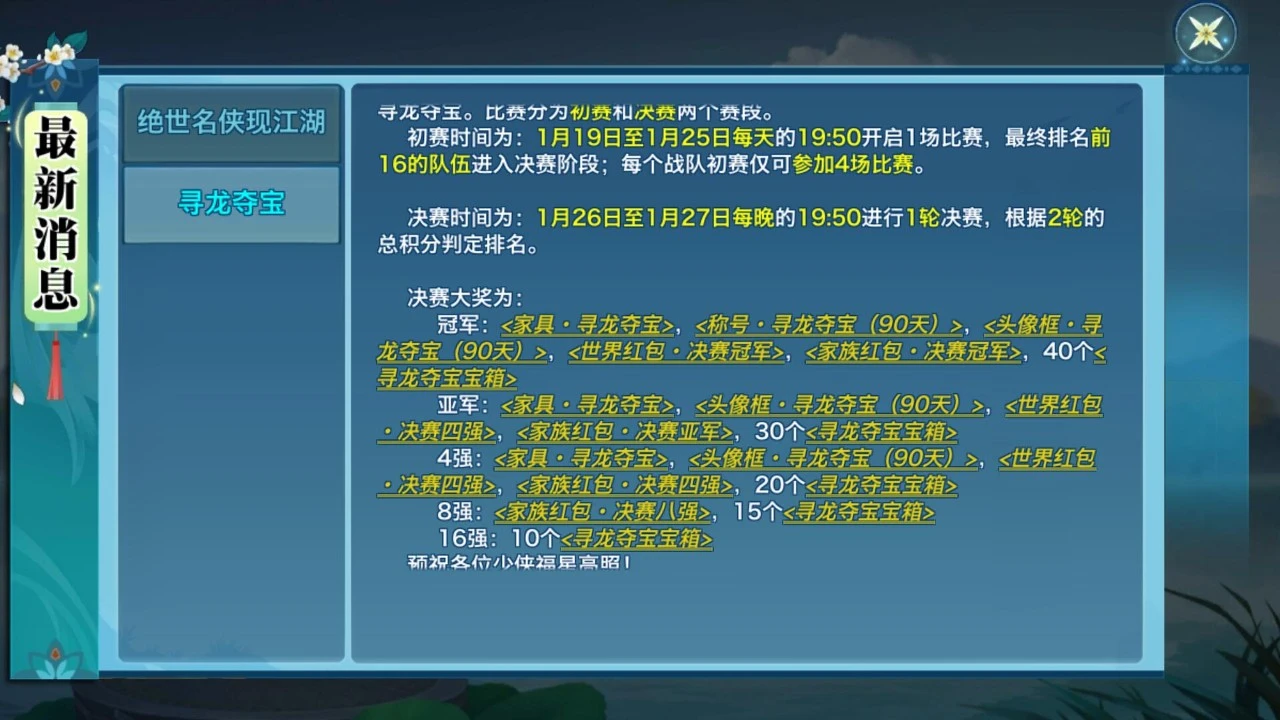 进入16强的队伍都将会获得寻龙夺宝宝箱奖励,打开后可获得丰厚奖励,更详细请少侠查看下图;