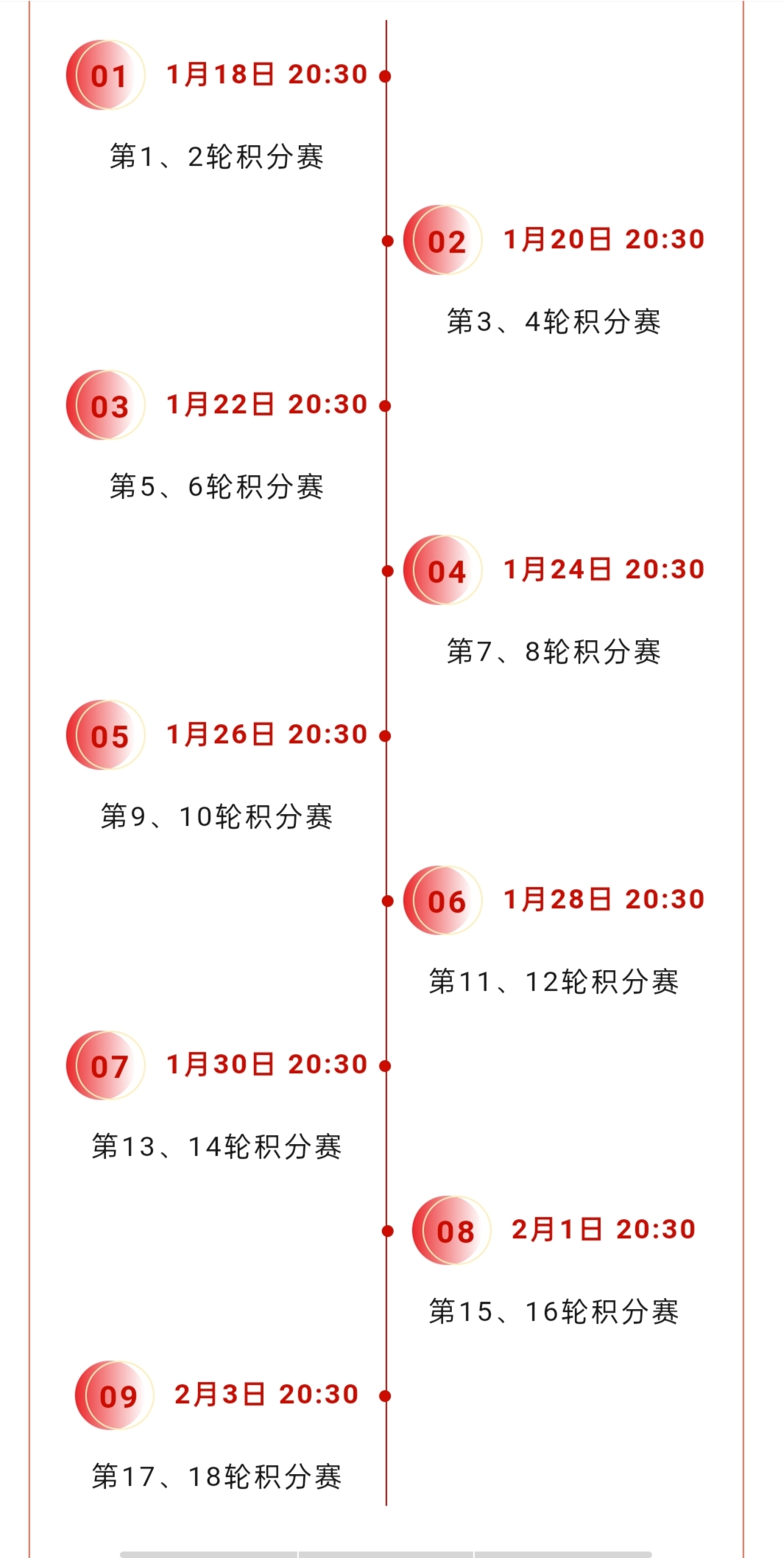 1月18日20:30将陆续开启两轮积分赛,随后每隔1天同时间段都将开启两轮积分赛,共计9天、18场积分赛