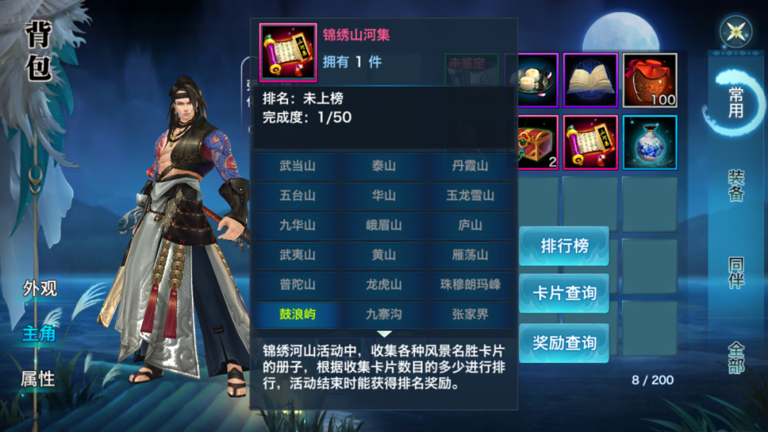 消耗元宝鉴定后可随机获得风景名胜卡片,少侠收集后可获得【锦绣山河集】。