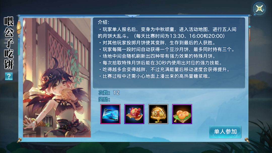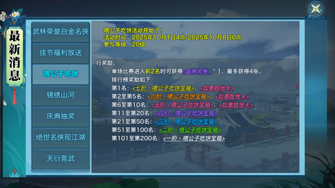恰逢中秋佳节,武林盟特地准备了趣味十足的休闲玩法!【喂公子吃饼】活动将于10月1日至10月7日每天13:30、16:00、20:00限时开启,少侠可进入活动地图参与5人月饼大作战!